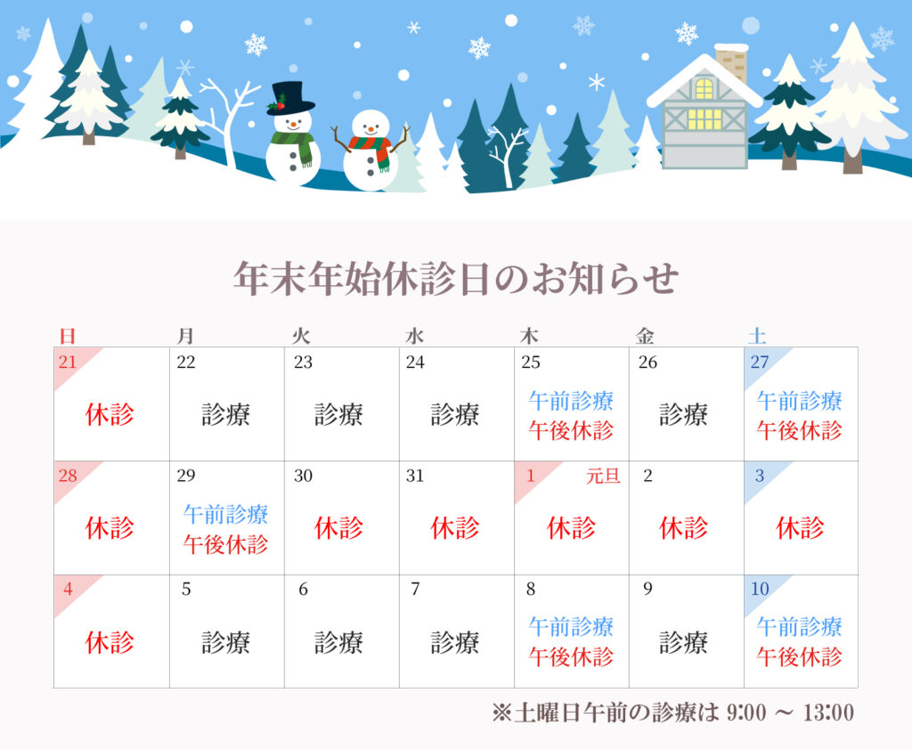 年末年始は12/29(月)午後~1/4(日)までを休診とさせていただきます。