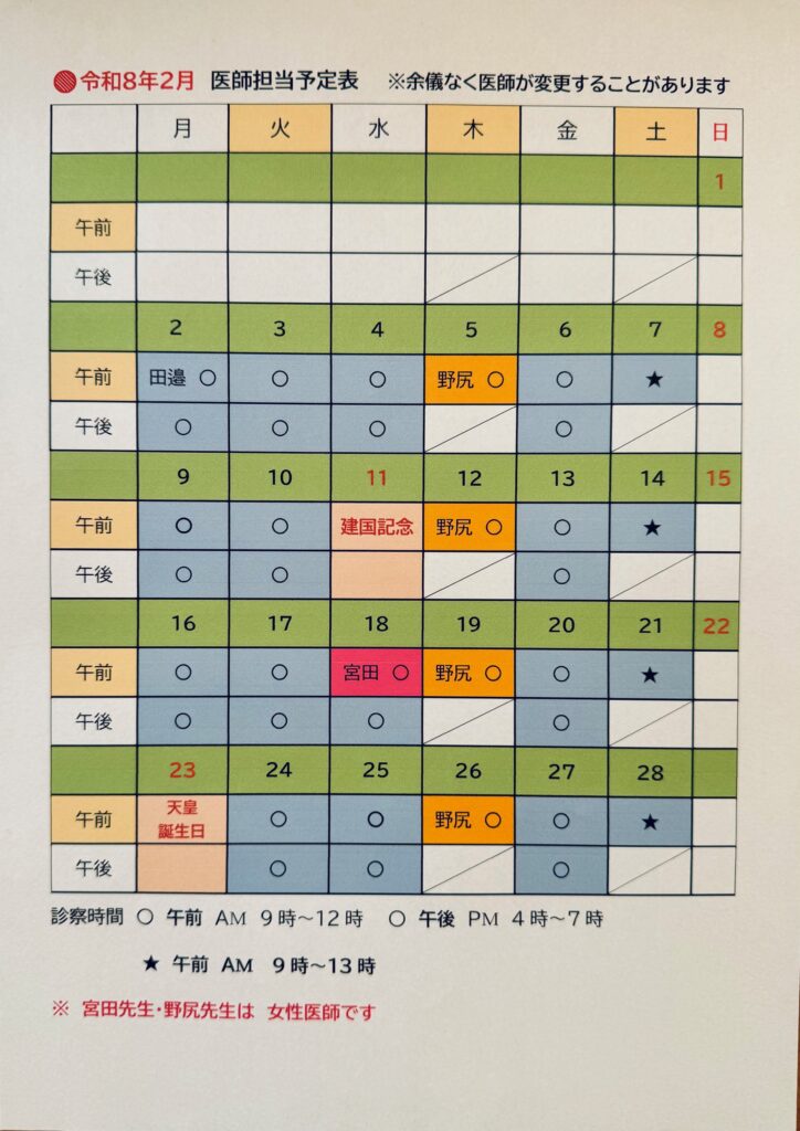 令和8年2月医師担当予定表